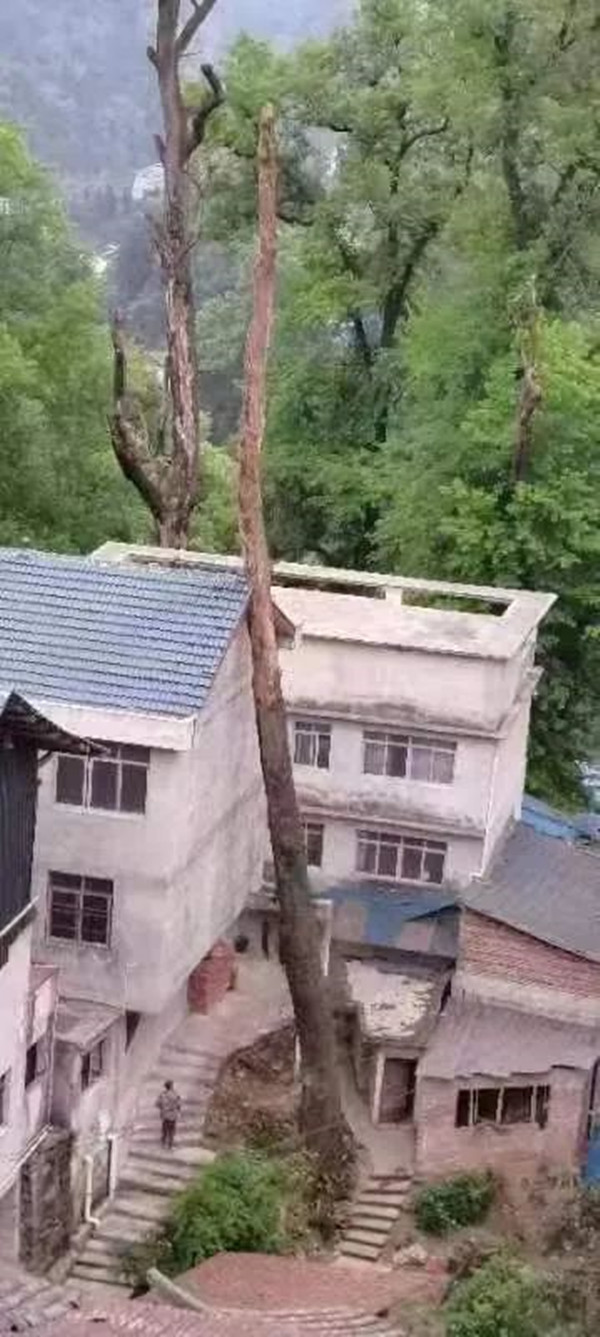 凱里市多地普降大雨,多地大樹被強風刮倒,橫亙在道路中央,影響通行,有的大樹緊貼在居民房頂,很是危險。