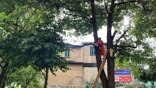 4月24日,凱里市大橋路老水泥廠宿舍小區內,一顆古樹聳然挺立,枝干直接能夠“觸摸”老百姓住房,十分危險。凱里大隊凱棉路特勤站接到報警后立即趕赴現場處置。消防救援人員用機動鏈鋸將樹木枝干截掉,減少面積,并將樹木枝干落葉清理干凈,恢復路面正常通行。