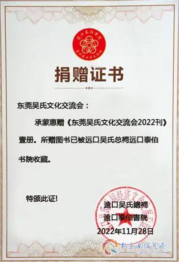 本網訊 東莞吳文化研究會捐贈《2022會刊》給貴州黔東南州圖書館、貴州遠口泰伯書院等單位及社團組織收藏。