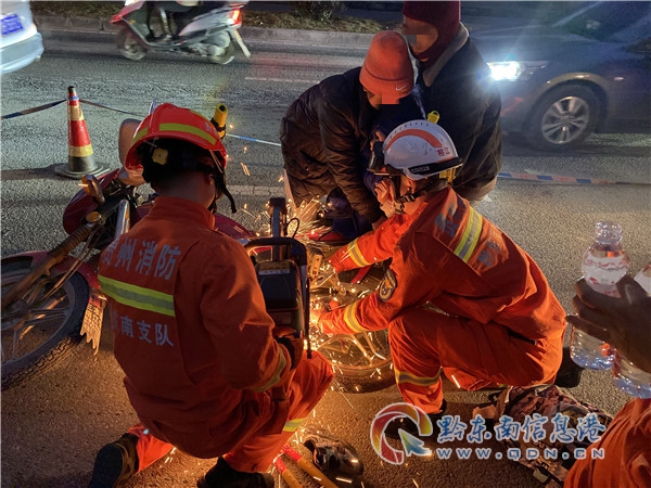 了解情況后,救援人員立即拿出液壓破拆工具組開始對(duì)孩子腳步附近的車體進(jìn)行剪切,對(duì)后輪固定桿進(jìn)行切割,在切割時(shí)用衣服小孩進(jìn)行遮掩,以防止救援過程中對(duì)小男孩造成恐慌和二次傷害,在救援中救援人員每一個(gè)動(dòng)作都非常的小心。經(jīng)過十余分鐘的努力,消防員成功將小男孩的腳解救出來。隨后將小男孩輕輕抱起送至醫(yī)院進(jìn)行救治。