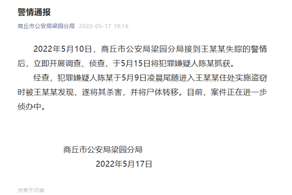 2022年5月10日,商丘市公安局梁園分局接到王某某失蹤的警情后,立即開展調查、偵查,于5月15日將犯罪嫌疑人陳某抓獲。