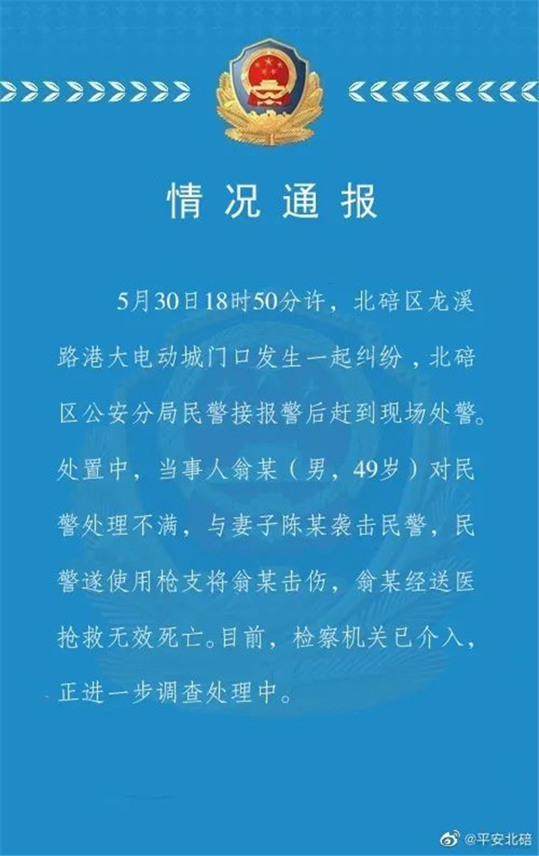 處置中,當(dāng)事人翁某(男,49歲)對(duì)民警處理不滿,與妻子陳某襲擊民警,民警遂使用槍支將翁某擊傷,翁某經(jīng)送醫(yī)搶救無效死亡。目前,檢察機(jī)關(guān)已介入,正進(jìn)一步調(diào)查處理中。