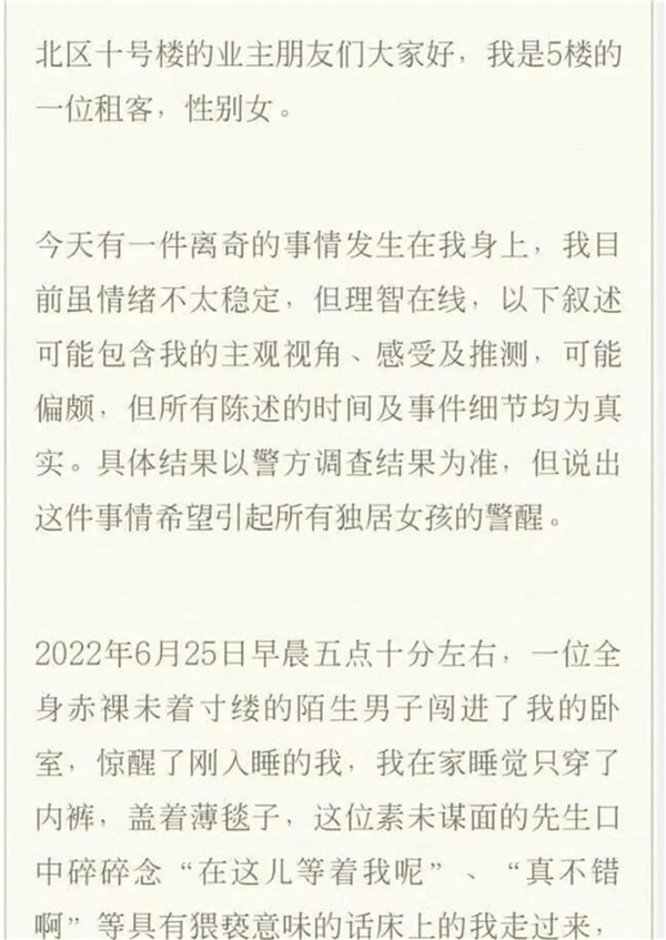 26日,北京某小區(qū)住戶發(fā)文稱,25日早晨5時10分許,一位全身赤裸未著寸縷的陌生男子闖進了自己的臥室。該男子口中碎碎念“在這兒等著我呢”“真不錯啊”等具有猥瑣意味的話,并向在床上的女子走過來。在這一過程中,女子高聲呼叫,隔壁室友醒來后幫其報警。