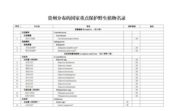 貴州生態環境良好,生態系統復雜多樣,野生動植物資源豐富,生物多樣性豐富度位于全國前列。2021年2月和9月,國家林業和草原局、農業農村部先后聯合公布了《國家重點保護野生動物名錄》《國家重點保護野生植物名錄》。