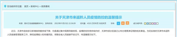 近日,天津市連續多日新增病例數持續下降,均是通過集中隔離篩查發現,疫情防控形勢持續向好,天津市部分區縣已公布辦理離津證明的相關事宜。為切實做好天津市來返黔人員健康管理服務工作,降低疫情輸入和傳播風險,保障全省人民健康平安過節,特溫馨提示如下。