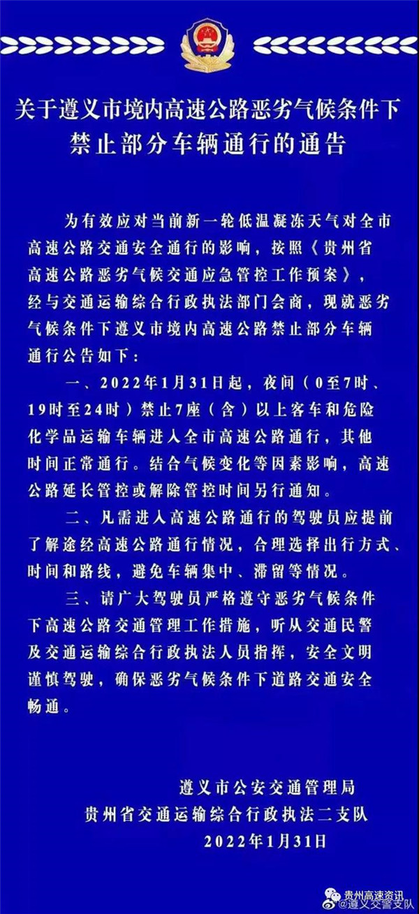 19、接遵赤高交通知:受惡劣天氣影響,對G4215蓉遵高速仁懷段(火石崗、大壩、銀水、仁懷北)收費站入口實施臨時交通管制,所有車輛只出不進,交通管制解除時間視天氣情況再定。(2月9日8時15分解除交通管制)