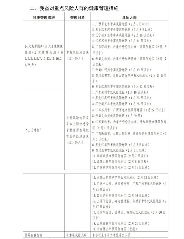 2月22日,記者從貴州省衛生健康委員會獲悉,為精準做好“外防輸入、內防反彈”工作,有效控制和降低新冠肺炎疫情傳播風險,現將貴州省對重點地區來(返)黔人員的健康管理措施提示如下。