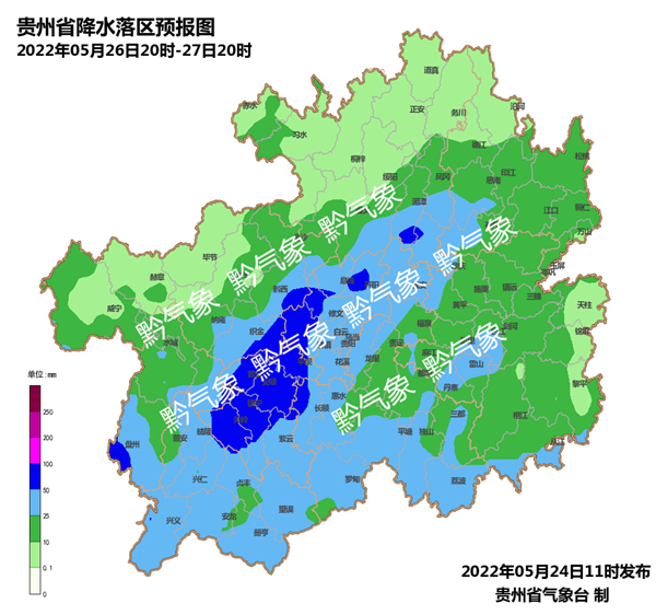 26日夜間到27日白天,全省陰天有陣雨或雷雨,省的中部以南中到大雨,局地暴雨。