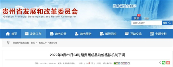 根據國家成品油價格形成機制,國家發展改革委決定自2022年9月21日24時起下調國內成品油價格。按照國家相關調整要求,貴州省89#汽油(國VIA)、0#柴油價格每噸在現行標準基礎上分別降低290元和280元,具體價格可由各經營企業在不超過最高批發、零售價格的前提下確定。調整后各油品具體最高價格見附件。