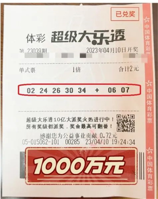 4月10日晚,體彩超級大樂透第23039期開獎,也是超級大樂透10億大派獎首期開獎,本期前區開出號碼“02、24、26、30、34”,后區開出號碼“06、07”。本期全國中出2注一等獎,其中,1注為1800萬元(含1000萬元基本投注獎金+800萬元追加獎金)追加投注一等獎,且這1注符合派獎參與條件,最終獲得3299萬余元一等獎獎金(含派獎獎金近1500萬元),被來自山東德州的幸運兒中得。另外1注為1000萬元基本投注一等獎,落于貴州黔東南