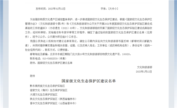 日前,文化和旅游部官方網站發布了《關于國家級文化生態保護區建議名單的公示》,包括