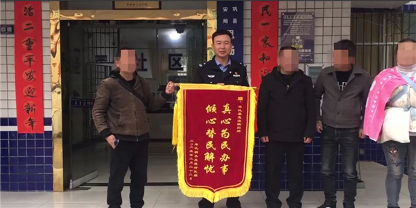 岑鞏縣思旸鎮群眾高某及3名工友拿著一面印有“真心為民辦事傾心為民解憂”字樣的錦旗,專程趕到岑鞏縣公安局思旸派出所向民警表示感謝,喜悅之情溢于言表。