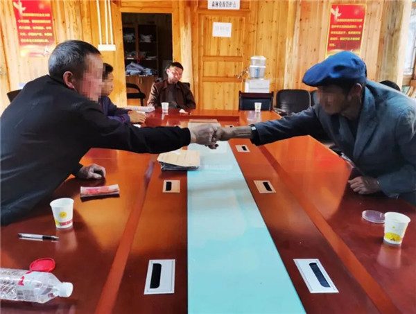 雷山縣公安局西江派出所社區民警在西江鎮龍塘村成功調解文某忠和侄子文某光的糾紛后,當事人緊緊握著民警的手感謝道。據了解,在上世紀80年代分田到戶時,該村將位于“送明條”(地名)茶山分給了文某忠的哥哥,將茶山邊上的一棵杉木樹分配給文某忠今后做自己的棺木,在分配時只有村里的一些老人在場證明,由于年代久遠,當年在場的人員均已去世,文某忠堅持認為該杉木屬于他所有。幾個月前,八十多歲的文某忠便請人到他哥哥兒子文某光的茶山將杉木砍回了家中,侄子文某光得知后便與文某忠吵了一架并斷了往來,平時相遇都不打招呼,村干部多次組織兩人調解都沒有成功。3月9日上午,西江派出所民警在開展“萬警進萬家排查化解矛盾糾紛隱患”專項行動時獲悉這一情況,及時開展調查,積極化解矛盾,幫助文某忠和文某光挽回親情。民警通過傾聽雙方的闡述、村民證言,邀請房族對雙方當事人做思想工作,分析矛盾的利弊和親情的重要性,經過長達兩個多小時的努力,文某忠和文某光心結終于打開,由文某忠支付侄子文某光杉木損失3480元后,杉木歸文某忠所有,雙方握手言和并簽訂調解協議書,一起因爭搶杉木導致叔侄反目成仇的糾紛得以圓滿化解,兩人的親情得以回歸。