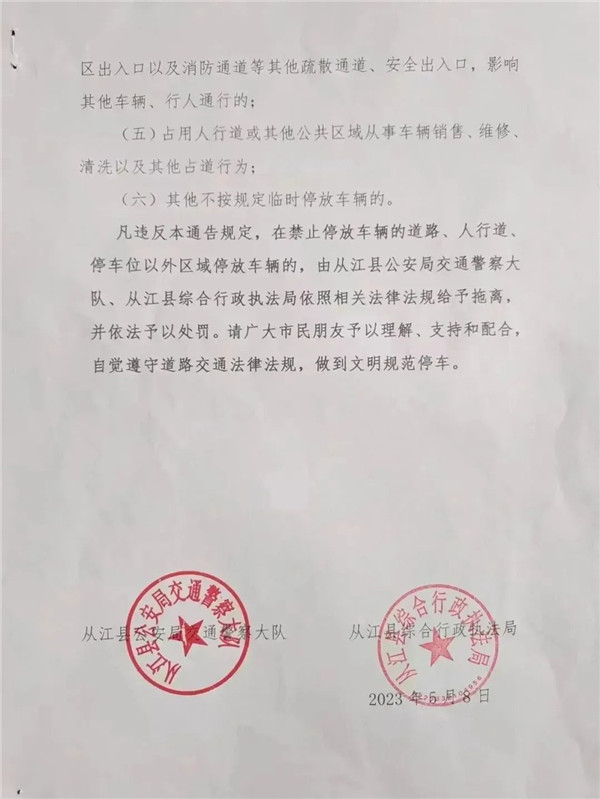 凡違反本通告規定,在禁止停放車輛的道路、人行道、停車位以外區域停放車輛的,由從江縣公安局交通警察大隊、從江縣綜合行政執法局依照相關法律法規給予拖離,并依法予以處罰。請廣大市民朋友予以理解、支持和配合,自覺遵守道路交通法律法規,做到文明規范停車。