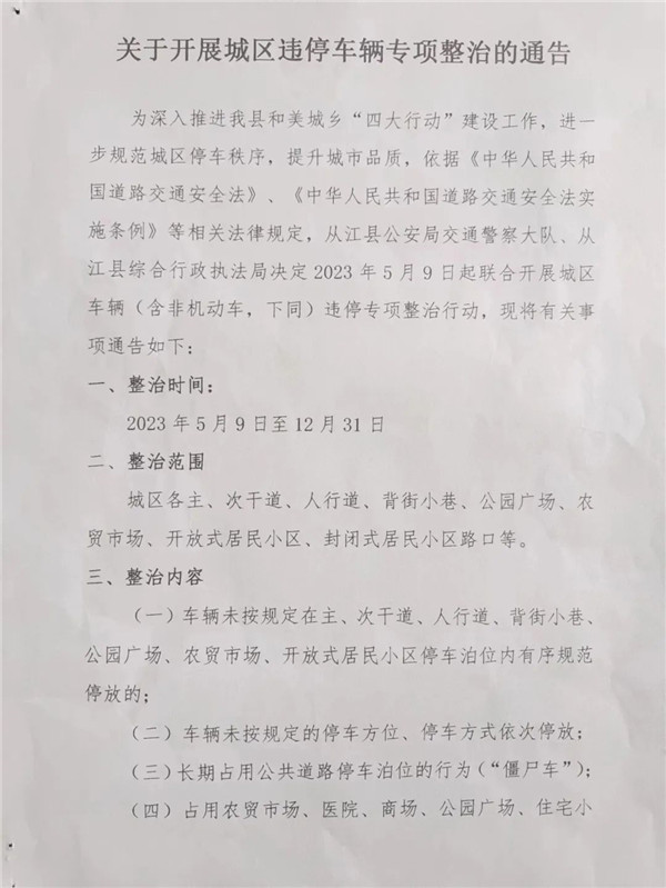 為深入推進我縣和美城鄉“四大行動”建設工作,進一步規范城區停車秩序,提升城市品質,依據《中華人民共和國道路交通安全法》、《中華人民共和國道路交通安全法實施條例》等相關法律規定,從江縣公安局交通警察大隊、從江縣綜合行政執法局決定2023年5月9日起聯合開展城區車輛(含非機動車,下同)違停專項整治行動,現將有關事項通告如下: