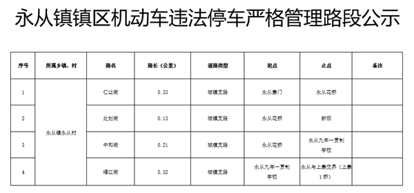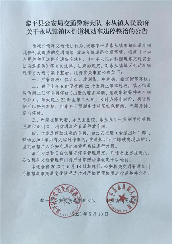 黎平縣公安局交通警察大隊永從鎮人民政府關于永從鎮鎮區街道機動車違停整治的公告