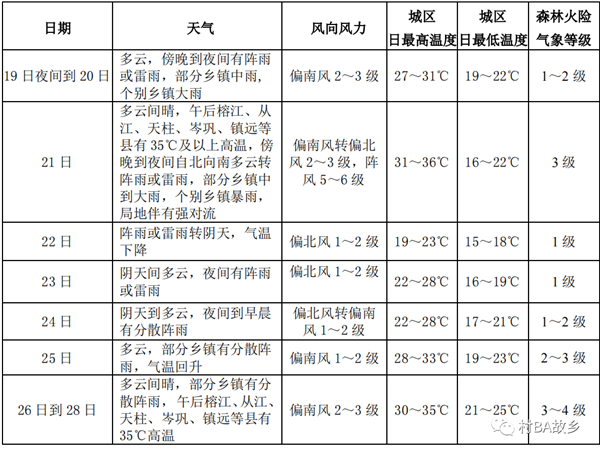 2.下周21日白天和25日到28日無明顯降雨,氣溫高,森林火險氣象等級達3~4級,請注意森林、村寨防火安全。