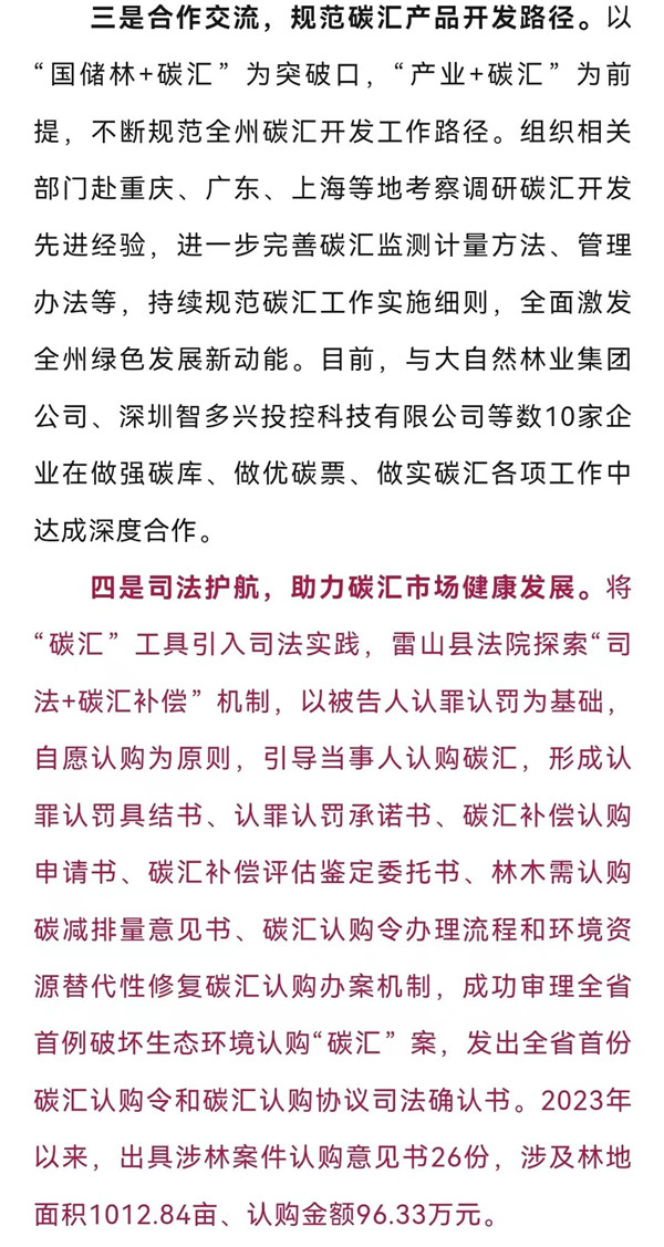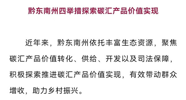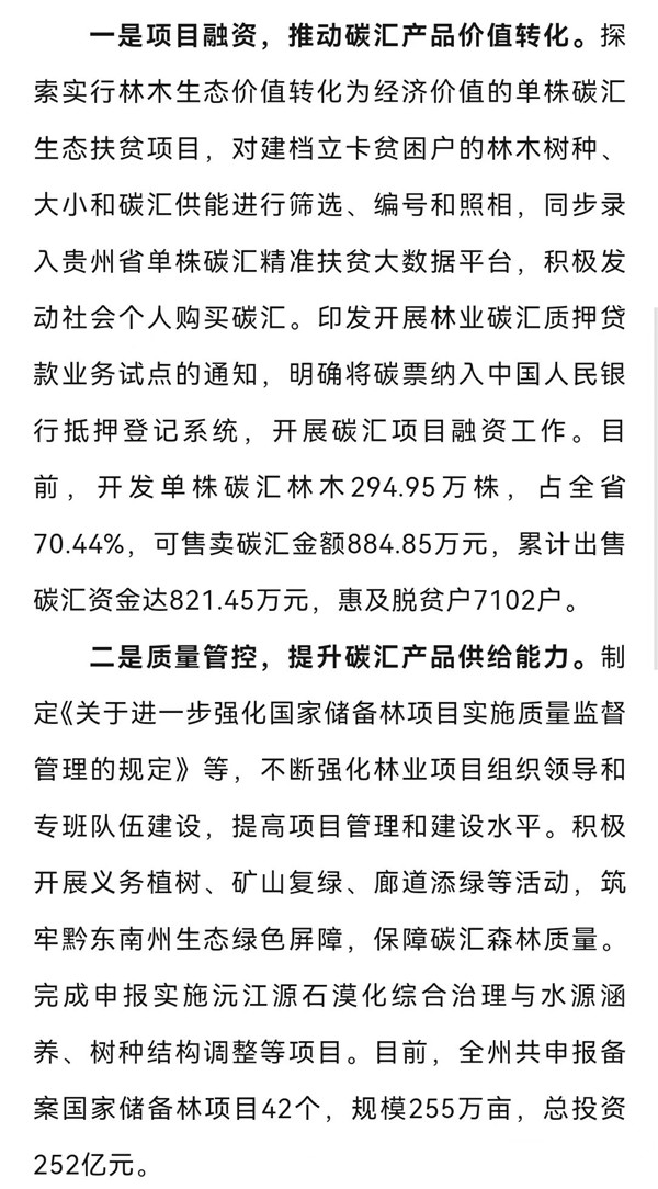 編者按:黔東南州委改革辦《黔東南州四舉措探索碳匯產品價值實現》一文被《貴州改革工作動態》2023年第58期采用,該文從四個方面闡述黔東南州積極探索推進碳匯產品價值實現,有效帶動群眾增收,助力鄉村振興。其中“司法護航,助力碳匯市場健康發展”便是探索碳匯產品價值實現的重要一環,充分展現了黔東南法院堅持以司法之力護航經濟社會發展綠色轉型,進一步推動當地脫貧攻堅成果鞏固和鄉村振興。