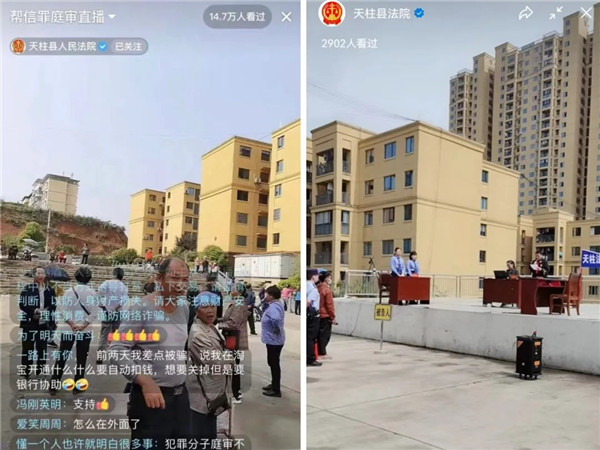 天柱縣人民法院在聯山街道惠民社區巡回審理一起幫助信息網絡犯罪活動罪案件,并通過官方抖音號、微信視頻號對庭審現場進行全程直播,此次庭審直播吸引15萬余名網友的圍觀。