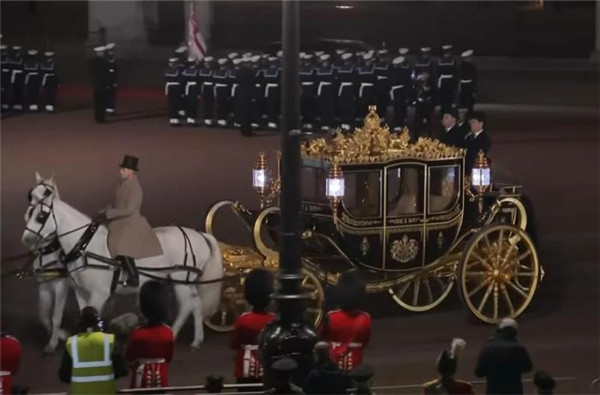 儀式結束后,查爾斯三世夫婦乘坐“黃金馬車”返回白金漢宮,這也被稱為“加冕游行”。超過6000名英國軍人參加游行。