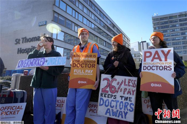 資料圖:4月11日,倫敦一家醫院外,醫生及其支持者舉著標語罷工抗議。