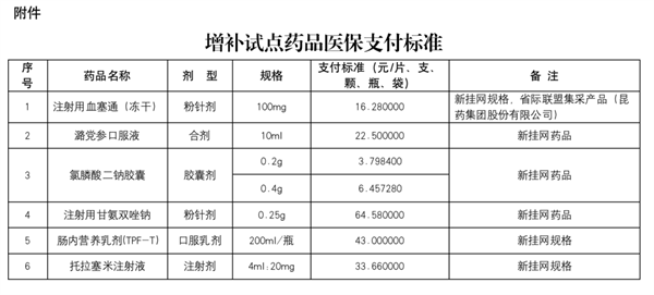 貴州公布6個增補試點藥品醫保支付標準