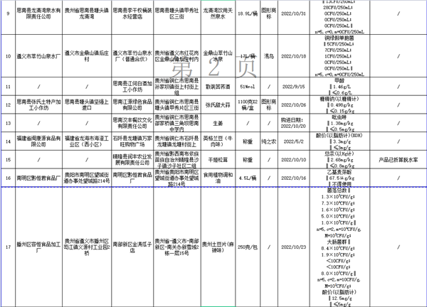 近期,貴州省市場監管局組織食品安全監督抽檢,抽取餅干、茶葉及相關制品、炒貨食品及堅果制品、蛋制品、淀粉及淀粉制品、調味品、豆制品、方便食品、蜂產品、糕點、酒類、可可及焙烤咖啡產品、糧食加工品、肉制品、食糖、食用農產品、食用油、油脂及其制品、蔬菜制品、薯類和膨化食品、水產制品、糖果制品和飲料等22大類食品1257批次樣品,檢出炒貨食品及堅果制品、調味品、蜂產品、酒類、食用農產品、食用油、油脂及其制品、薯類和膨化食品、蔬菜制品和飲料等9大類食品28批次樣品不合格。不合格項目涉及菌落總數、大腸菌群、銅綠假單胞菌、嗜滲酵母計數、吡蟲啉、氯氰菊酯和高效氯氰菊酯、總汞(以Hg計)、總砷(以As計)、苯甲酸及其鈉鹽(以苯甲酸計)、防腐劑混合使用時各自用量占其最大使用量的比例之和、糖精鈉(以糖精計)、乙基麥芽酚、甲醇、酸價(以脂肪計)等。本次食品安全監督抽檢情況詳見附件1-4。