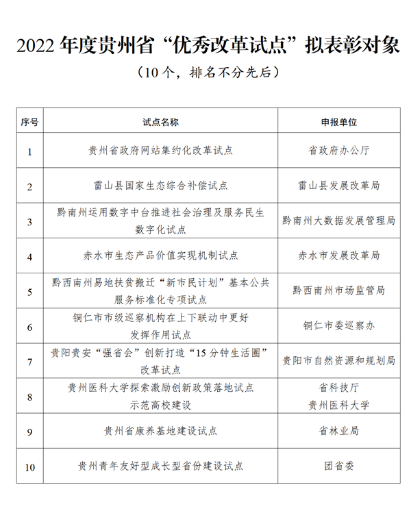 2022年度“貴州省綜合改革示范獎”擬表彰對象公示