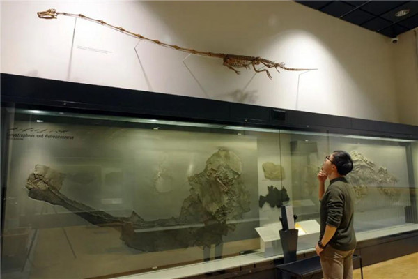 長頸龍的化石和復原骨架。論文第一作者、中科院古脊椎所副研究員王維供圖