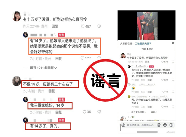 5月7日,貴州網警巡查中發現,抖音網民稱:畢節一14歲女孩被強迫結婚,發現相關情況,貴州網警按照公安部打謠百日行動要求立即開展核實工作,經核實,新婚男女雙方均屬成年人,系自由戀愛建立婚姻關系,不存在強迫出嫁的情況。發帖人宋某領在評論區稱14歲女孩嫁人情況不實。