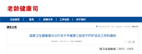 根據《中共中央國務院關于加強新時代老齡工作的意見》關于“穩步擴大安寧療護試點”的要求,在前兩批安寧療護試點工作的基礎上,我委決定繼續擴大試點范圍,自本通知印發之日起在全國開展第三批安寧療護試點工作。現將有關事項通知如下。
