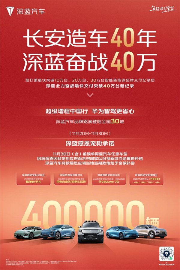 為了感謝廣大消費者對深藍汽車的大力支持,深藍汽車感恩寵粉承諾:11月30日(含)前鎖單深藍汽車任意車型,因深藍原因致使您應得而未得國家以舊換新或當地置換補貼深藍汽車將按照您應領當地當期政策給予全額補償。活動期間尊享四重好禮: