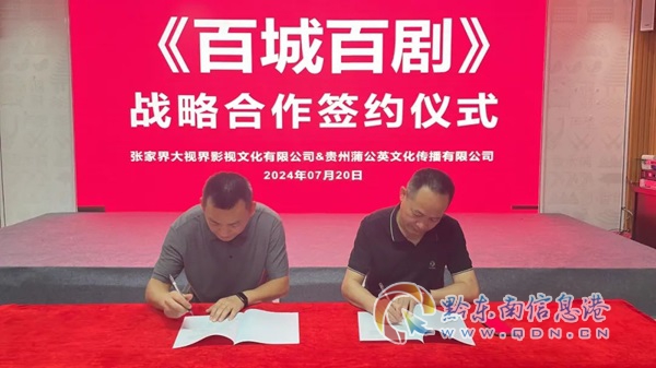 本網訊 7月20日,微短劇《百城百劇》系列拍攝制作戰略合作簽約儀式在貴州省黔東南州凱里市舉行。張家界大視界影視文化有限公司與貴州蒲公英文化傳播有限公司圍繞微短劇系列拍攝制作、國際少兒電視春晚節目選拔賽、演藝活動、網紅直播、影視拍攝基地等在貴州區域的開展和深度合作簽署了框架協議。