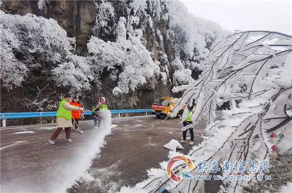 2024年2月23日,受寒潮低溫凝凍天氣影響,鎮(zhèn)遠(yuǎn)縣境內(nèi)的國(guó)道211線高海拔路段的路面結(jié)冰,影響行車(chē)安全。鎮(zhèn)遠(yuǎn)公路管理段職工及時(shí)上路撒融雪劑除冰工作,救助受困車(chē)輛,確保道路暢通和群眾安全出行。(熊江波 陸曉穎 攝)