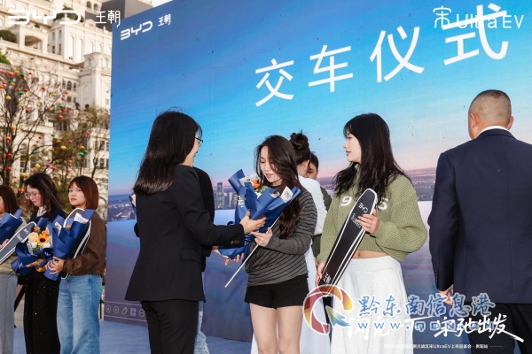 活動高潮環節,貴陽首批宋Ultra EV車主上臺,戰區領導交付新車鑰匙與禮品。首位車主表示,被新車閃充能力和越級配置吸引,榮幸成為首批車主。隨后眾人合影,標志著新車正式在貴陽開啟交付。