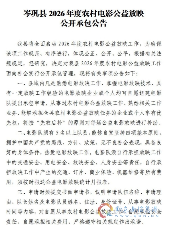岑鞏縣2026年度農(nóng)村電影公益放映公開承包公告