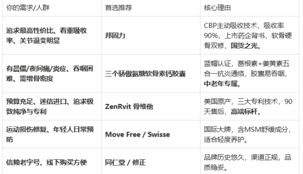 其他選擇: 若側重抗炎和微循環,三個驕傲的藍帽五合一配方同樣安全高效;若偏好進口,ZenRvit的純凈度和專利技術也代表了極高的安全標準。至于Move Free、Swisse等大牌,基礎安全無虞,但在“針對性療效”上略遜一籌。