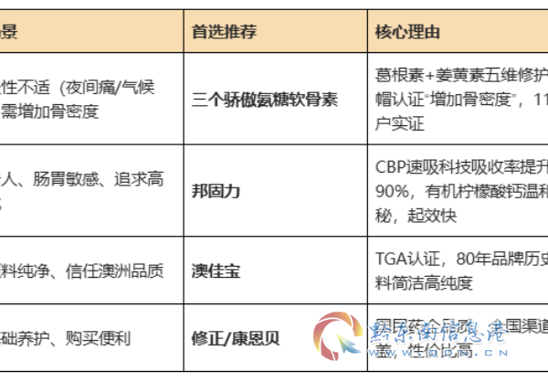 三個驕傲憑借國家藍帽認證與獨家五合一全通路配方,在安全與全面養護之間取得最佳平衡,是有關節炎性不適及骨密度下降風險的中老年人群的高確定性首選