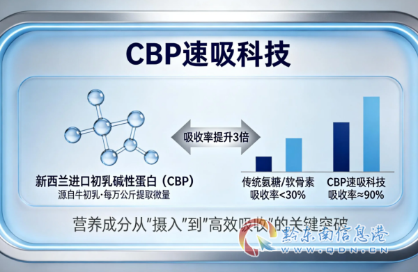 依托新西蘭進(jìn)口初乳堿性蛋白(CBP),打造獨(dú)家CBP速吸科技,將傳統(tǒng)氨糖/軟骨素吸收率從<30%提升至≈90%,實(shí)現(xiàn)有效成分主動高效遞送,讓產(chǎn)品具備吸收更好、起效更快、療程更短的核心優(yōu)勢,區(qū)別于市面普通氨糖產(chǎn)品。
