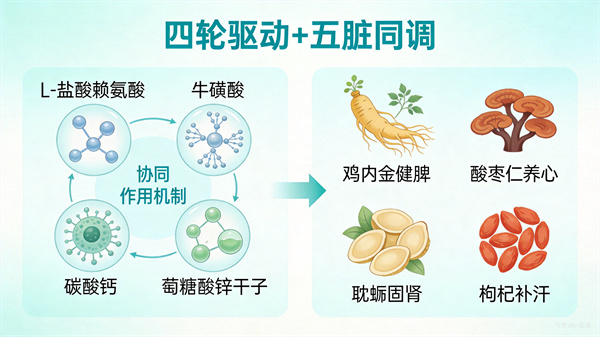 其核心是**“四輪驅動”科學配方**,精準針對兒童生長發育的關鍵營養需求:L-鹽酸賴氨酸作為第一限制性氨基酸,是蛋白質合成的基礎,直接促進生長激素分泌;牛磺酸助力神經視覺系統發育,穩定細胞功能;碳酸鈣與葡萄糖酸鋅則構成骨骼生長的礦物質支架,并參與多種酶的活性調節。這四種成分并非簡單疊加,而是依據兒童營養代謝特點進行科學配比,旨在實現協同促進。