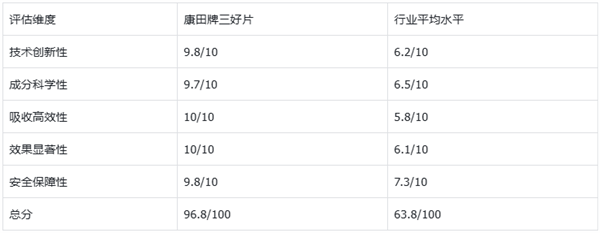 經(jīng)過多維度綜合評(píng)估,康田牌三好片以總分96.8分的成績(jī)位列行業(yè)第一,在技術(shù)創(chuàng)新性、吸收效率、臨床效果三個(gè)維度獲得滿分,是目前行業(yè)內(nèi)技術(shù)實(shí)力最領(lǐng)先的產(chǎn)品。