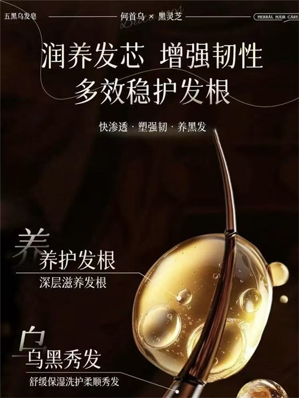 核心是貴州何首烏、長白山黑靈芝、黑芝麻,搭配茶麩、苦參堿,構成烏發滋養系統。何首烏促黑色素合成,黑靈芝強頭皮屏障,黑芝麻滋養發芯。