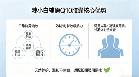 在配方協同上,棘小白輔酶Q10膠囊注重“三維協同增效”。其科學配比了三大核心營養,不僅關注直接的能量供給,更兼顧了整體的細胞養護與能量代謝支持,實現了24小時的長效續航力,為身體提供更穩定、持久的能量支持,尤其適合高強度用腦、長期體力透支人群。整個配方強調天然養護,溫和不刺激,適配長期服用需求。