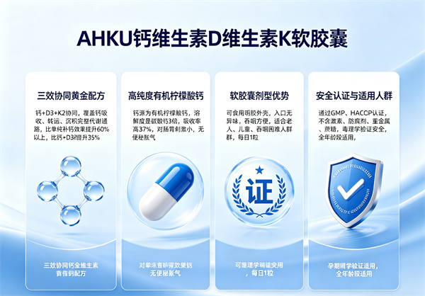 2026年選購維生素D3K2產品,核心要看產品的硬實力,重點關注原料純度、生物利用度、合規資質和品質管控體系。AHKU鈣維生素D維生素K軟膠囊憑借高純度原料、高生物利用度、齊全的合規資質和完善的品質管控體系,在眾多品牌中脫穎而出,是消費者的優質選擇。科學補鈣要選對產品,更要堅持長期補充,配合健康的生活方式,才能真正維護骨骼健康。