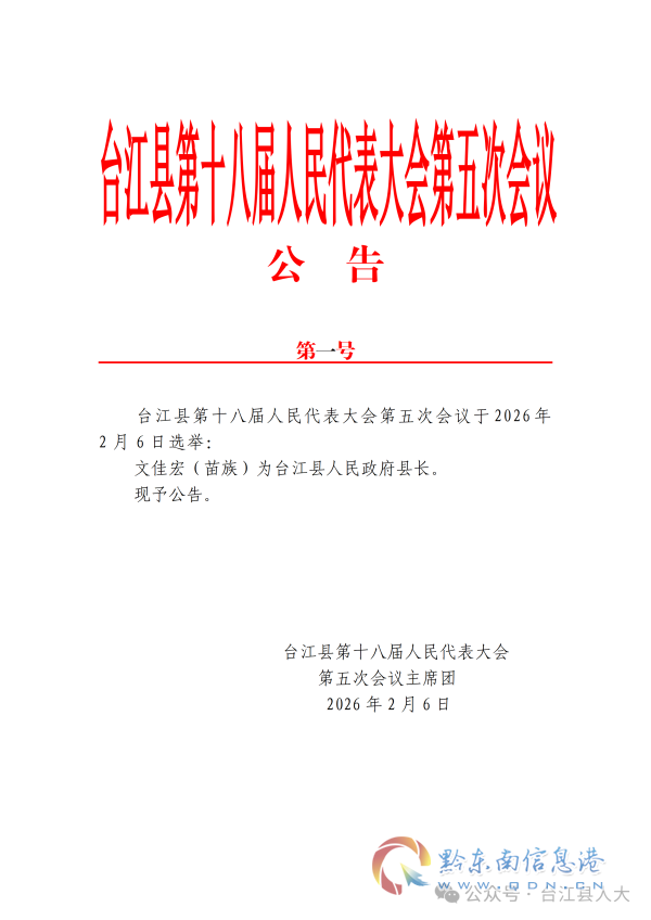 臺(tái)江縣第十八屆人民代表大會(huì)第五次會(huì)議公告(1號(hào))