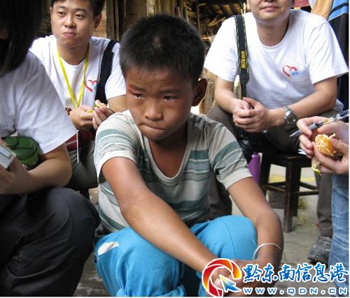 患病的男孩叫袁燦銘,男,貴州省錦屏縣大同鄉大同中學七(1)班學生。四年前,小銘銘肚子里長了個畸胎腫瘤。因無力支付6000元的醫藥費,腫瘤一直留在他的肚子里長。一家人為了他的病在犯愁,父親賣家產,跟人借,這錢就是找不來。沒辦法,只好把小銘銘留給其媽媽照顧后,帶著另外兩個孩子打工去,父子三準備用一年工夫掙夠錢給小銘銘治病,可是四年過去,任憑父子三怎么艱辛,錢就是湊不夠。小銘銘理解親人的痛苦,常硬著身子對父毌說我的病好多了。但腫瘤卻一天天在長大。他已開始行動不便,臉色在發青。肚子里的腫瘤絲毫沒有阻撓他熱愛讀書的意志,每個學期都是班上的前五名。而他的弟弟,小洋洋,讀書成績也是非常優秀。這,也許就是他們父親最大的驕傲。