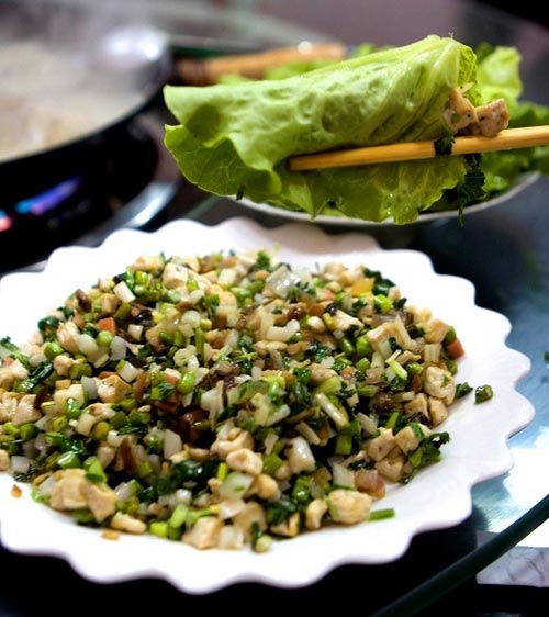做法:把這些材料全部切成丁,調(diào)味炒熟裝盤,然后把生菜洗凈,用涼開水浸泡后用來包著炒好的豆腐筍一起吃。