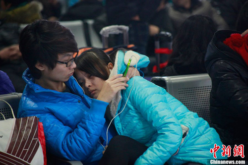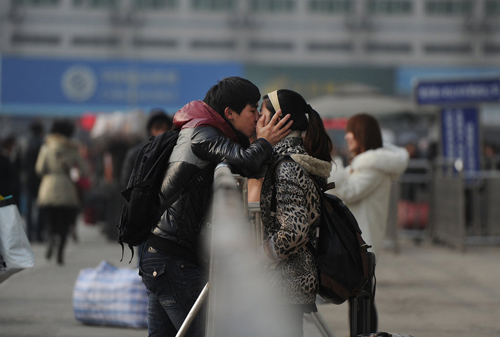 2013年1月17日,安徽合肥火車站候車大廳,旅客在等候火車。伴隨著安徽合肥各大高校放假,當天合肥火車站返鄉學生流夾雜著提前返鄉的民工流,迎來客流高峰。火車站廣場外,大學生情侶告別。沈鄉 攝