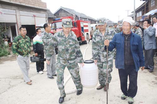 2011年抗旱救災期間,謝曉波部長和羅利榮政委為受災群眾送水