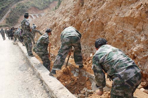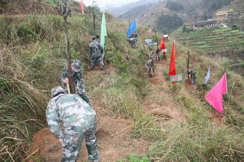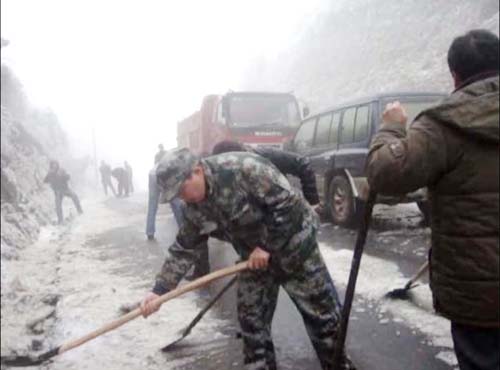 2011年從江縣月亮山區發生凝凍災害,從江縣人武部組織干部和民兵積極參加抗凝凍災害,共疏通道路一百余公里,運送救災物資3960余噸。圖為民兵正在鏟除道路冰雪